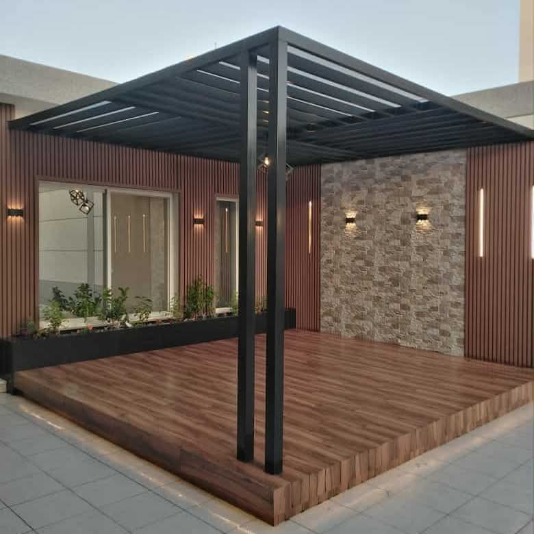 مظلات خشبية تعطي شكل طبيعي متناسق مع الحديقة.