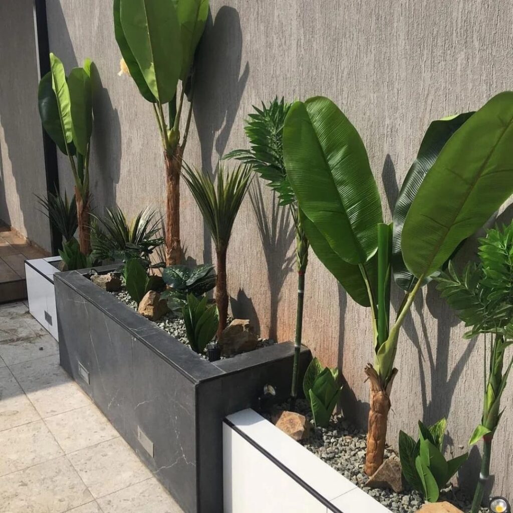 ج: النباتات المحلية مثل النخيل والأثل والبونسيانا مناسبة. كما بعض الأنواع الأجنبية كالياسمين والفيكس والأكاسيا. أشجار الظل مثل الكونوكاربس والكاسيا والفيكس بنجاميني مفيدة.
