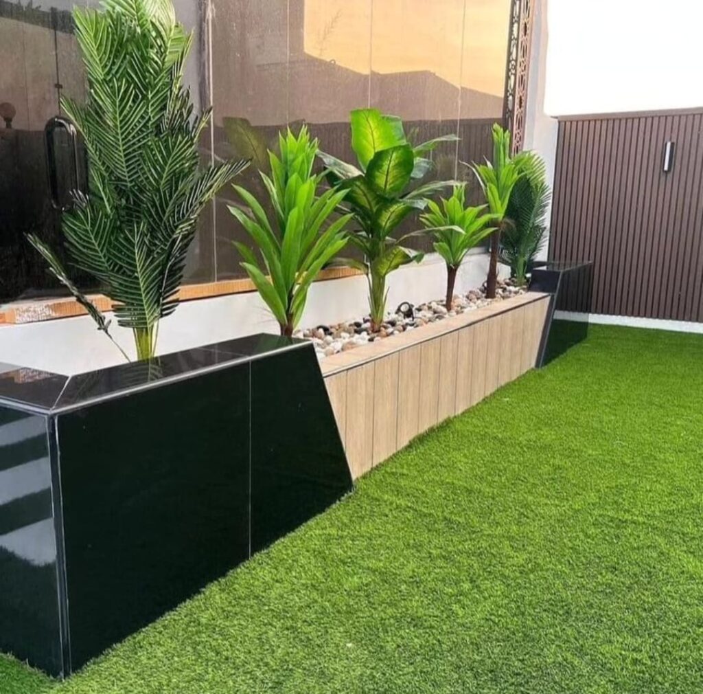 العشب الصناعي: عملي، ما يحتاج صيانة كثيرة، ومثالي للمساحات الصغيرة.
